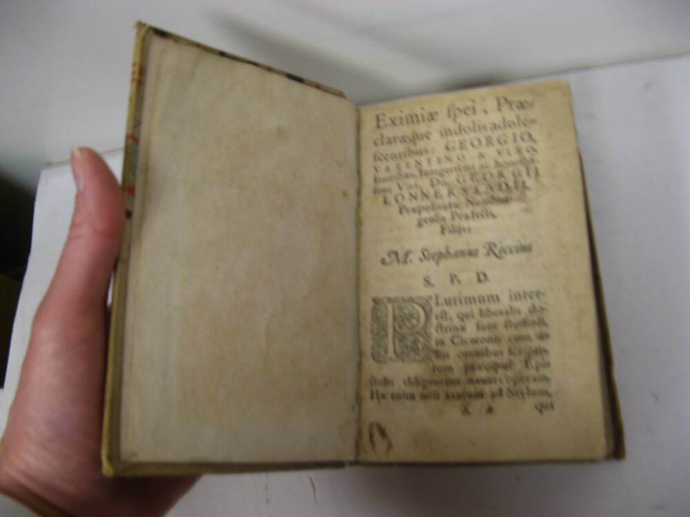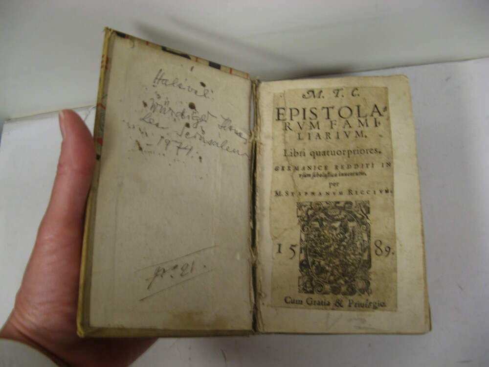 RARE BILINGUAL LATIN & GERMAN EDITION of Cicero`s letters, with translation by the noted 16th-century philologist Stephan Reich. Cicero`s letters to and from various public and private figures are considered some of the most reliable sources of information for the people and events surrounding the fall of the Roman Republic. Among the recipients of the letters were such illustrious figures as Caesar, Pompey, Octavian, and Cicero`s son Marcus Tullius Cicero Minor. 150x95mm. 409 double pages. Rebound vellum Hardcover. Cover and spine stained and wrinkled. Front cover detached. Spine partly detached from binding. Front cover corners and spine hinges worn. Original title-page pasted on front whitepage. First Title-and dedication pages coming loose from binding. Small hole on first dedication page bottom corner near binding - NO damage to text. Small hole on last page upper corner with damage to only one letter of the text. Pages yellowing, age-stained and wavy. [SUMMARY]: This extremely rare 16th-century bilingual Latin-German edition of Cicero`s letters is otherwise in good condition.