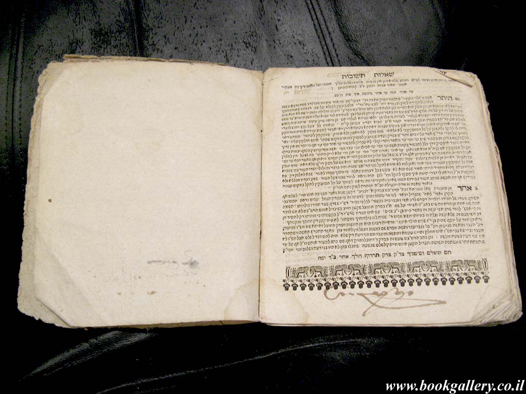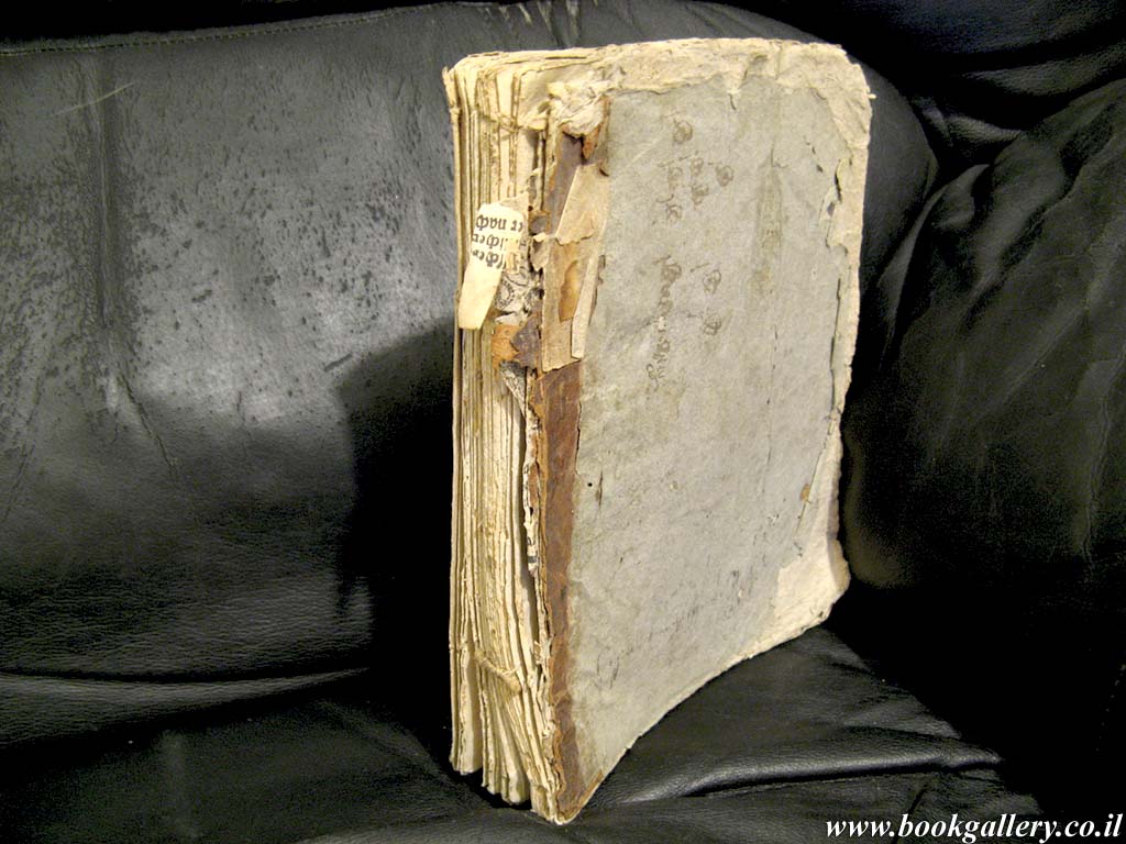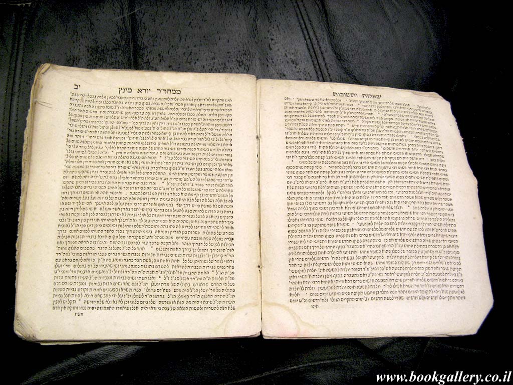 RARE! Second edition of "Psakim ve-Sheelot", a volume of halachic rulings by two important 16th centurie Rabbis, Judah Minz and Meir Katzenellenbogen of Padua. 200x165mm, 91 double pages. No cover. Stamps on title page. Pen inscription on title page and last few pages. Pages 85-91 detached. Pages yellowing, with few aging stains. Page edges creased. Despite the external wear, this rare book of Jewish law is in good condition for reading.